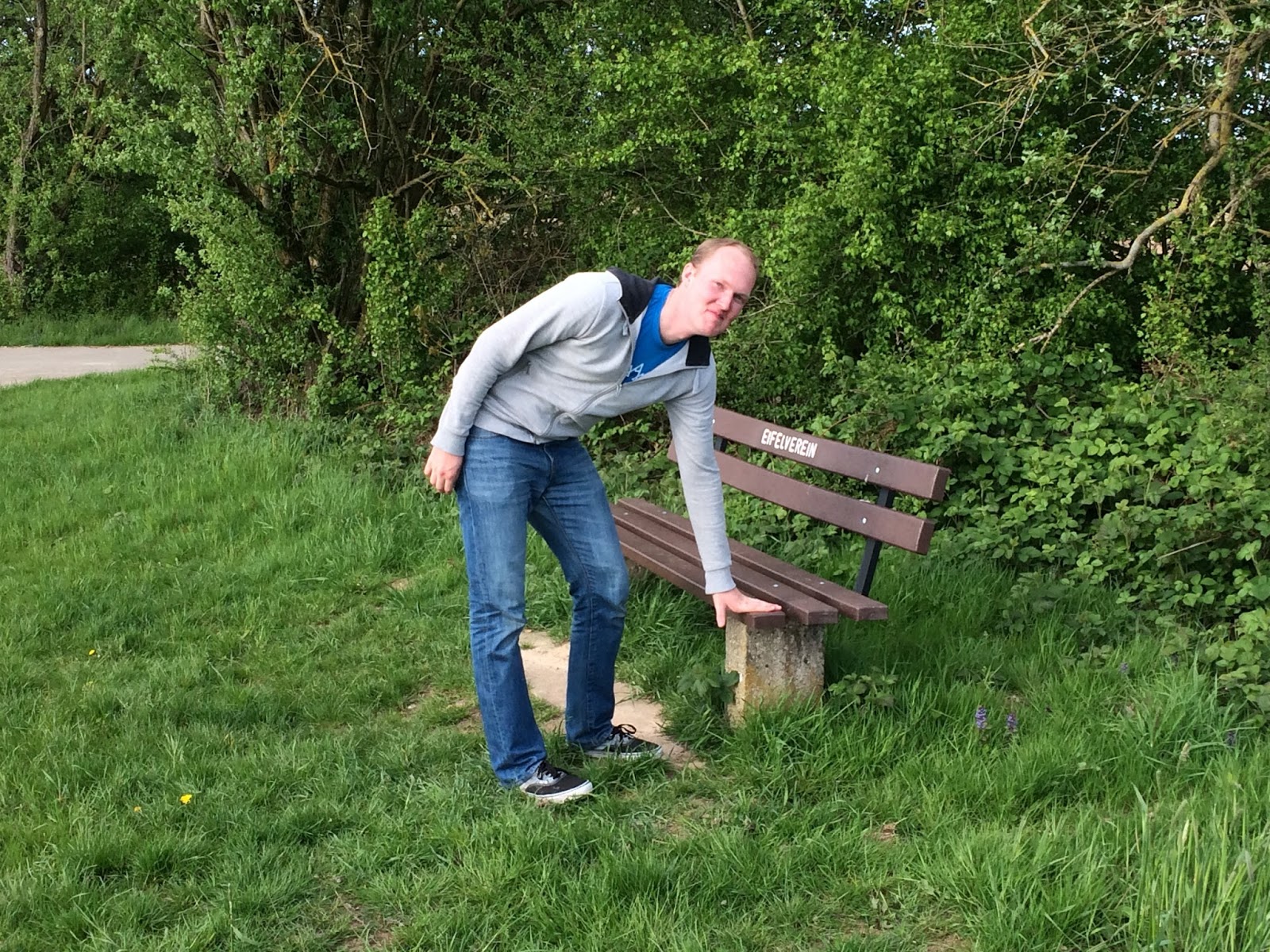 | Yes Ethan, you must actually TOUCH the bench! It was a three mile, round-trip chore done everyday. Well, except when Mark hid in the bushes.... |