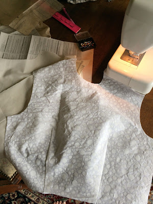 I haven't sewn in at least thirty years, so don't think I wasn't completely doubting of my abilities. I decided to sew the dress in muslin first, just to see if I had any chance of being successful. The funny thing was that I hadn't bought enough muslin for the entire dress. Don't judge--like I said, I haven't sewn in thirty years, and I didn't bother to check the back of the pattern for the amount of fabric needed. So, I happened to have some leftover cotton fabric from a quilt that I made Johannah. It was white, and actually looked quite lovely once I finished the bodice.